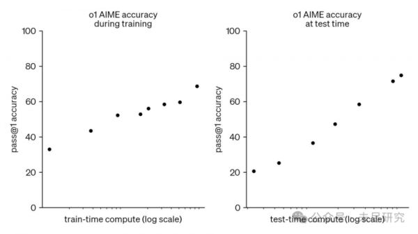 o1 的性能在训练时和测试时的计算量增加时,都能平稳提升。