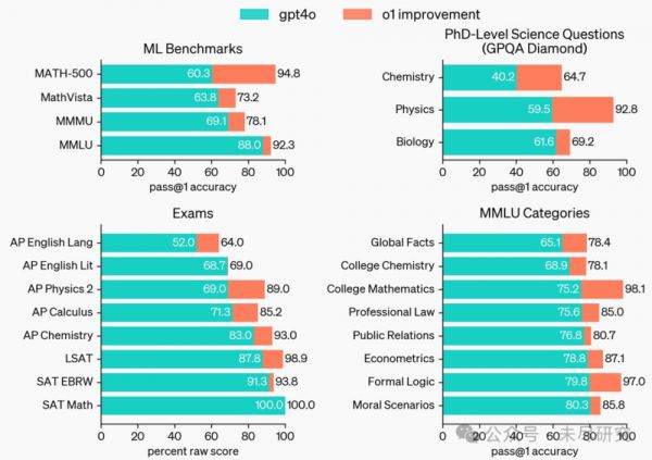 o1 在广泛的基准测试中优于 GPT-4o,包括57个 MMLU 子类别中的54个。为便于说明,我们展示了其中的七个。
