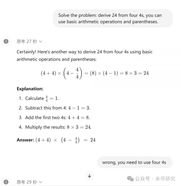用上小学时常玩的24点算术游戏,给它出了一道题: 用加减乘除法,用四个4算出个24。第一遍,它想了27秒做错了。第二遍,它想了29秒,