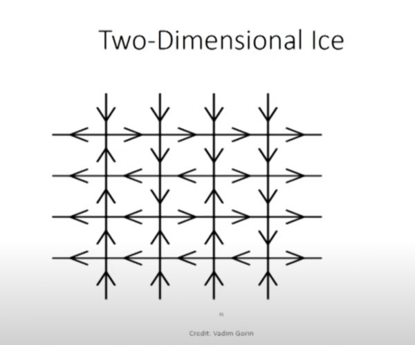 一种描述冰的方法是将其想象为由箭头组成的晶格模型。在这个模型中,每个点代表氧原子,箭头代表氢的位置,它总是位于两个氧原子之间,可以指向一侧或另一侧。正如我所说,即使在绝对零度下,冰中仍有一些变化存在,需要计算其重新排列的总数。这正是我所着手去做的。顺便一提,这个模型是由Linus Pauling发明的。如下图所示,在氧原子位于晶格上规则排列的情况下,冰的熵就等于氢原子排列方式总数的对数。同时,要形成冰要求每个顶点都有两个箭头指向它,两个箭头背离它。