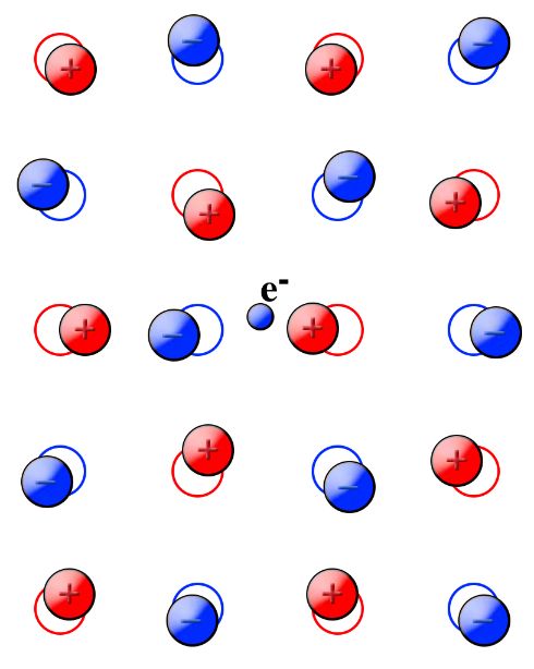 接下来的几年是我与Joel Lebowitz合作的高光时期。我们证明了库仑力的热力学极限存在。这一定理,和Freeman Dyson与Andrew Lenard证明带电粒子具有能量下限的结论一起,证明了“物质的稳定性”。让我来稍微解释一下这一概念。一个原子,如你在这下图中看到的那样,有一个原子核,以及围绕原子核旋转的电子。电子所带电荷量与原子核所带电荷量相等。而要构成宏观的物质,需要很多原子组合在一起。