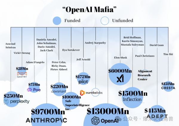 “OpenAI Mafia”即OpenAI 黑帮,一词指的是OpenAI离职的员工或创始人们,他们继承了“Paypal黑帮”的风范,如今已成为硅谷最炙手可热的创业群体,每个人都备受风险投资(VC)青睐,动辄获得数十亿美元的融资。例如,前OpenAI科学家Ilya Sutskever刚刚在天使轮融资中获得了10亿美元的资金。