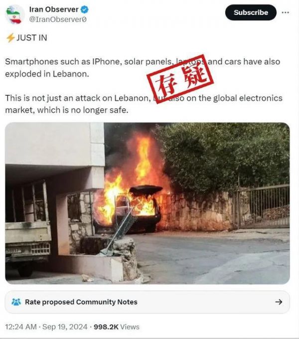 9月19日,@IranObserver0发布的推文截图。该说法附有一张显示汽车燃烧起火的图片。反搜发现,此图由X平台用户@HaidarAkarar发布,@HaidarAkarar在18日发文称,“黎巴嫩南部纳巴蒂耶的一辆汽车在车内的通讯设备爆炸后起火”。以色列媒体Israel Hayom、英国镜报等在报道中均使用了这一图片,报道中没有提到有iPhone等智能手机设备被引爆。