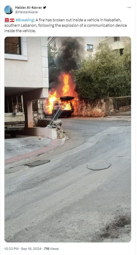 @HaidarAkarar于18日发布图片,称“黎巴嫩南部纳巴蒂耶的一辆汽车在车内的通讯设备爆炸后起火”。