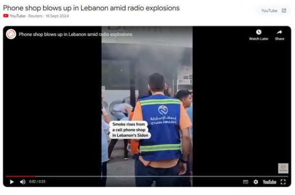 9月18日,路透社报道的视频显示,有黎巴嫩手机店在无线电爆炸事件中被炸毁。