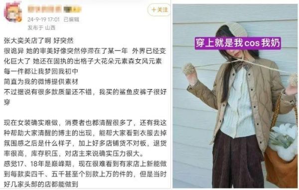 某穿搭博主表示,张大奕的审美好像停止在某一年。“外界已经变化很大了,她还固执的出格子大花朵元素森女风元素,每一件都让我梦回初中”。配图还有“穿上就是我cos我奶”的大字。