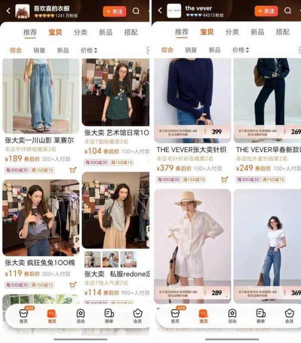 相比之下,张大奕显得有些守旧,她依然守着淘宝店铺大本营。在这里积累的千万粉丝成绩,并没有复制在其他平台。她在抖音、小红书等平台的粉丝量,皆小于50万。