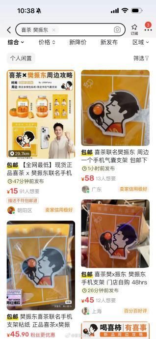 【#喜茶樊振东联名周边被炒至45元##喜茶樊振东联名手机支架被炒至45元#】喜茶推出@樊振东 联名周边,一杯饮品加上联名手机支架售价25元,两杯饮品加上两张贴纸售价38元。不少网友反映,上了闹钟准备开抢,可是还是一打开App就已经全部售罄。@新浪科技 发现,在二手平台,喜茶樊振东联名周边已被炒至45元。(新浪科技)