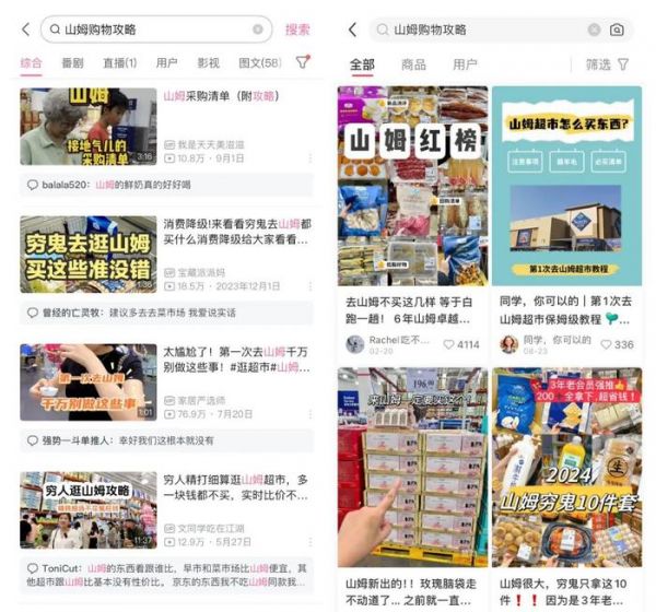 「庄帅零售电商频道」观察发现,在小红书和B站上,随手搜索山姆购物攻略,就有上百万条。诸多博主和网友纷纷晒出在山姆购物的照片和心得,让更多的人对山姆产生了浓厚的兴趣。