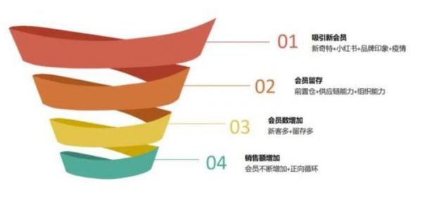 至于留存会员,前置仓+供应链能力+组织能力起到了非常重要的作用,前置仓可以让会员不需要到店就可以在线上购买商品并快速送达,供应链能力则让会员能购买到稳定品质和持续创新的定制商品和自有品牌商品;组织能力则为全渠道运营和供应链提供组织保障。