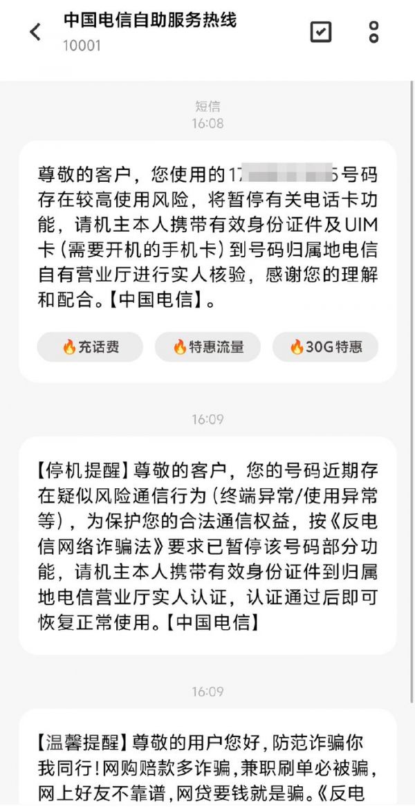 我是万万没想到,只因为我出差,在外地拨打了几次电话,就收到停机短信说我疑似风险通信行为,再说直白一些,就是我怀疑我涉嫌电信诈骗了,然后我这张用了7年的电信手机卡就被停机了,只能接收短信和接听电话。
