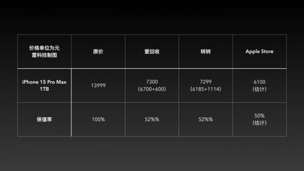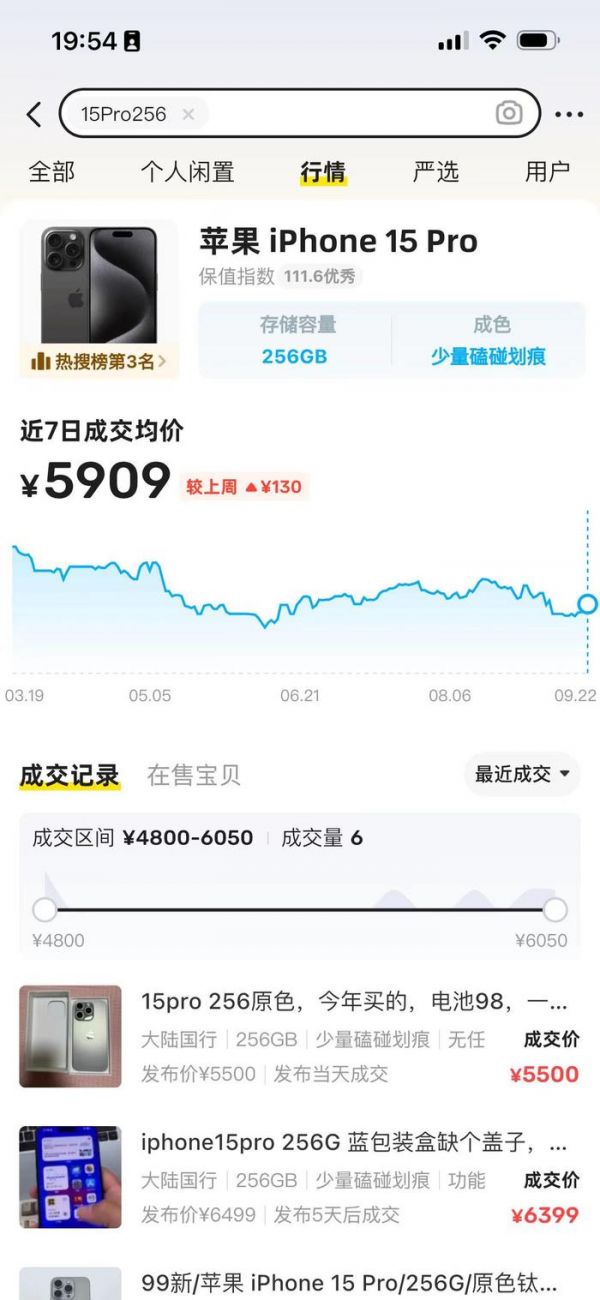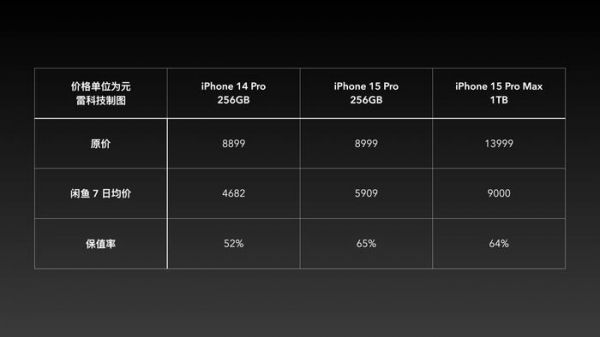 原价 8999 元的 iPhone 15 Pro 256GB(少量磕碰) 在闲鱼的 7 日成交均价为 5909 元,保值率 65%;iPhone 15 Pro Max 1TB(几乎全新) 7 日成交均价为 9000 元,保值率 41%;iPhone 14 Pro 256GB(少量磕碰)7 日均价为 4682 元,保值率 52%。