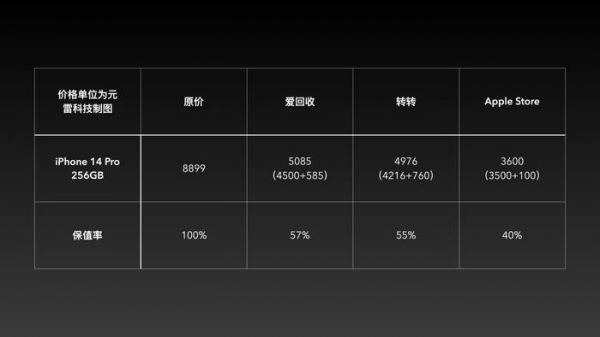 图片来源:雷科技但如果我们回收更旧一点的机型,比如 14 Pro,那情况就有些不同了,原价 8899 元的 iPhone 14 Pro 256GB,即使是仅过保修的完美成色,在爱回收报价为 5085 元(4500+585),转转报价 4976 元(4216+760),Apple Store 报价 3600 元,保值率分别为 57%、55% 和 40%。