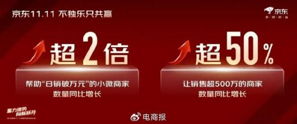与此同时,京东还立下雄心壮志,计划在双十一期间帮助“日销破万元”的小微商家数量同比增长超2倍,同时让销售超500万的商家数量同比增长超50%。