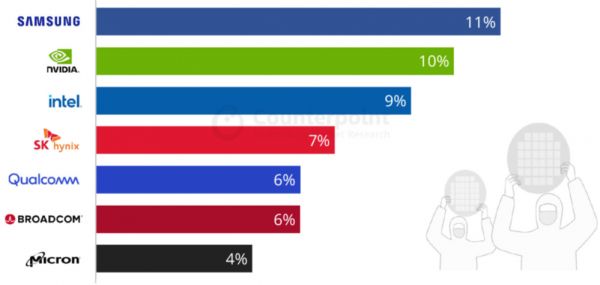 全球七大半导体公司排行(按营收)来源:counterpoints
