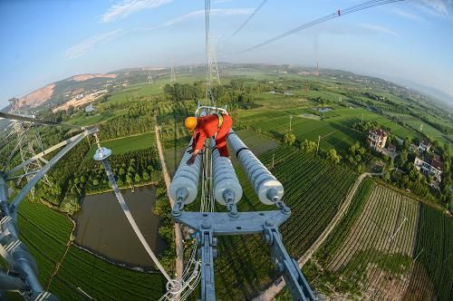 浙江省送变电工程公司工作人员正在线路铁塔上验收 新华社