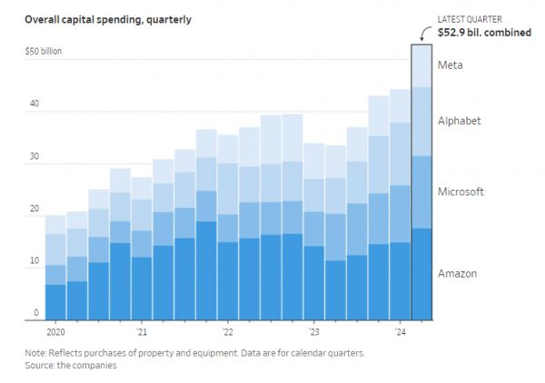 而一级投资市场对于AI相关的投资力度仍然不减。据国外媒体报道,仅就2024年第二季度,亚马逊、微软、谷歌母公司Alphabet和Meta,在人工智能领域的投入就高达500多亿美元。