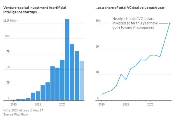 而到目前为止,人工智能创业公司所获得的风投总额,已经高达641亿。2024年至今,仅人工智能领域的投资已经占据全行业一级市场投资的30%以上。
