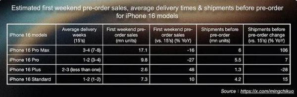 分析师估计,iPhone 16系列在首周末预购销量预估约3700万部,和去年同期的iPhone 15系列相比,销量同比下降了约12.7%。