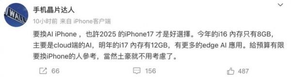 还有博主爆料称,明年的iPhone 17 Pro系列将升级为12GB内存,可提供更多的端侧Ai支持。