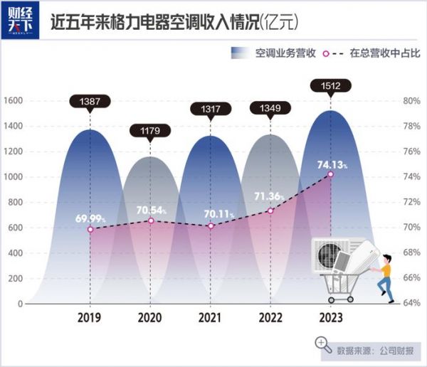 空调是家电市场最大的品类,但国内空调消费已逐渐步入存量市场。自2020年来,格力电器超过七成的营收,主要是靠空调这一大品类撑起。“格力对空调单一产品的依赖度不降反升,在空调市场下行趋势明显的大环境之下,不是一个令投资者开心的消息。”家电产业分析师刘步尘对《财经天下》说。