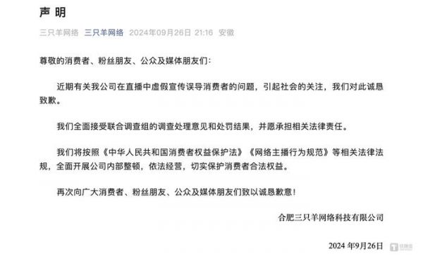 紧接着,三只羊公司发布了致歉声明,字里行间透露出低姿态的悔意。在声明中,三只羊表示,全面接受合肥市联合调查组的调查处理意见和处罚结果,包括没收违法所得及罚款共计6894.91万元的决定。同时,愿意承担由此产生的所有法律责任,并积极配合相关部门的后续工作。