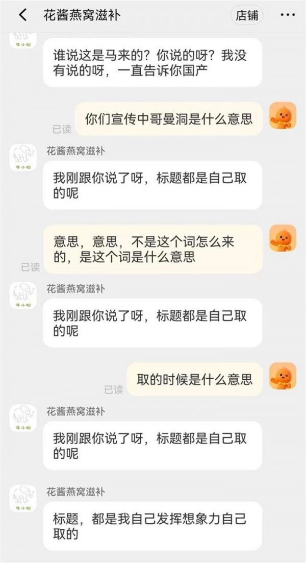 然而,面对消费者的合理质疑,这些商家非但没有丝毫悔意,反而不断地狡辩推诿,除了将“进口”说成是“进到嘴巴里”之外,还有诸如“你从菜市场买条鱼回家煮着吃有没有杀过菌?为什么对燕窝要另眼相看?”“为什么工厂挑毛的可以吃,自己挑毛的不能吃?”“产品标题里的哥曼洞是自己发挥想象力取的标题,和马来西亚地名无关”等一连串的谬论。商家不断地转移话题,巧舌如簧,无非就是为了掩盖产品潜在的安全隐患,掩盖自己违法违规的事实。这种对消费者生命健康极度不负责任的态度,让人不禁要问:这些人的良心何在?