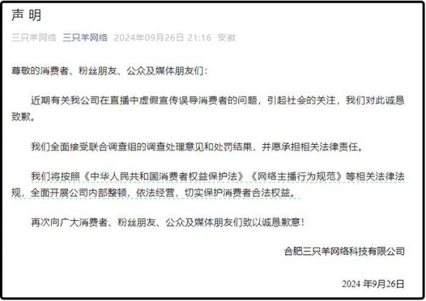 同日晚间,三只羊发布声明诚恳致歉,并表示“全面接受联合调查组的调查处理意见和处罚结果,并愿承担相关法律责任。”