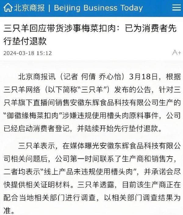 事发后,三只羊公司很快给出回应,称公司已启动消费者登记,并陆续开始先行垫付退款。