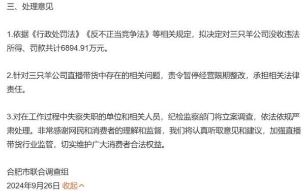 9月26日晚,合肥市联合调查组就三只羊直播带货中存在的有关问题发布情况通报。