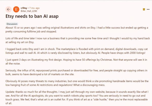 在社交论坛Reddit上,Hall发布了一封标题为“Etsy应该尽快封禁AI”的帖子,控诉AI如何抢占了自己的生意。