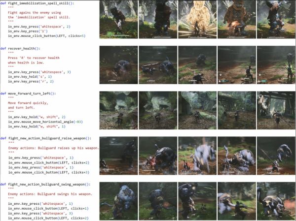 VARP智能体框架在接收输入的游戏屏幕截图后,通过运用一组VLMs进行推理,最终生成Python形式的代码来操控游戏角色,包括一系列原子命令的组合,如轻攻击、躲避、重攻击和回血等。