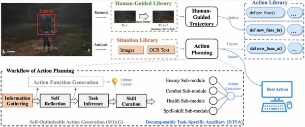 系统根据输入的游戏屏幕截图,挑选或生成符合当前情境的动作,然后这些动作和情境会被存入或更新到这两个库中。