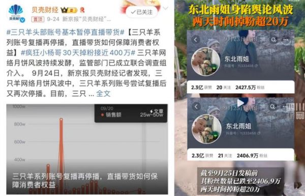 图源:新浪微博头部主播近一个月内的密集性“翻车”,进一步加剧信任危机,消费者开始“用脚投票”。公开数据显示,自被辛巴“炮轰”以来,疯狂小杨哥单日最高掉粉量超过14万,截至9月24日,小杨哥粉丝总数在近一个月内减少近400万。东北雨姐也在深陷假红薯粉丝及产品问题风波后,两日内掉粉超20万。其他多位头部主播的粉丝数量,也存在或多或少的减少。