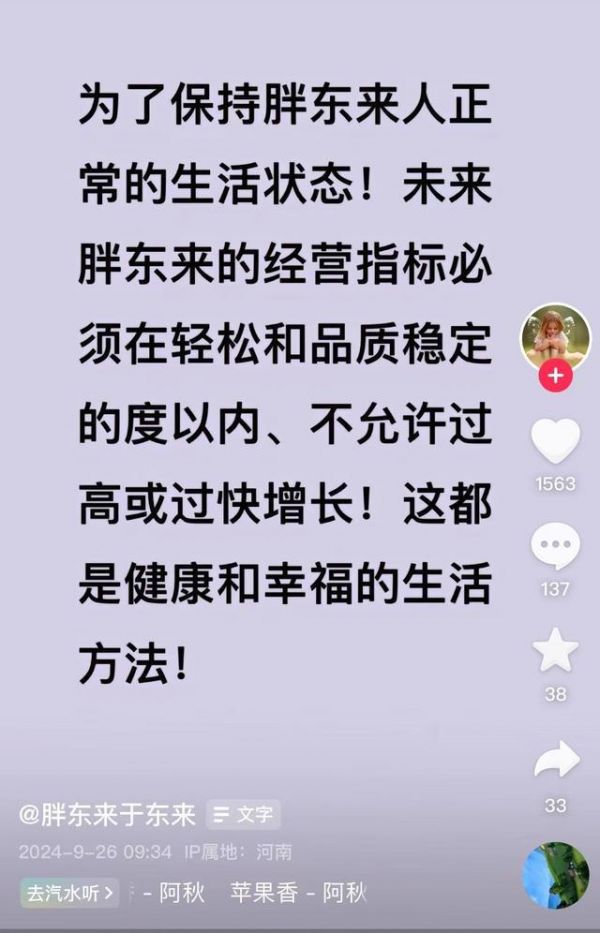 9月26日凌晨,胖东来董事长于东来抖音官方账号发布视频称,“关于帮扶企业行动、帮扶联商学员企业和永辉步步高还将持续两年左右时间、这些企业基本能自己进行调整!为了胖东来员工正常的工作和生活、胖东来只是不再派团队到新的企业进行帮扶!”