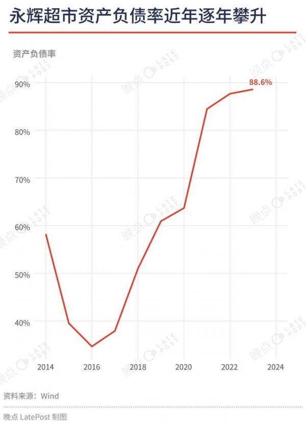 永辉的资金运转早已告急,已连续三年亏损,亏损总额超过 80 亿元;过去四年,其资产负债率从 63.69% 升至 88.6%,意味着公司 8 成以上的资产都是通过借债获得,远超行业平均水平 —— 据中国上市公司协会数据,去年 A 股批发和零售行业的平均资产负债率为 64.18%。