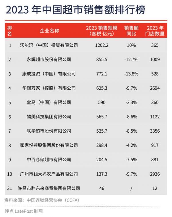 2023 年,永辉全年的销售额达到 855.5 亿元,全国有 1000 家门店,连续三年位居中国超市业态第二名,2020 年永辉曾跃居至中国超市销售额的第一名。