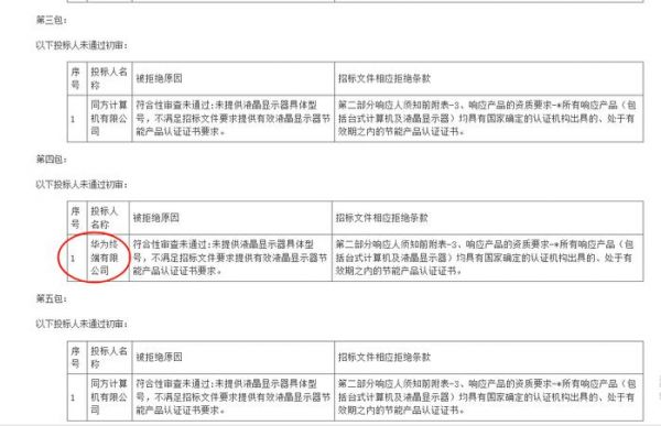 华为终端有限公司也因为未提供液晶显示器具体型号,不满足招标文件要求提供有效液晶显示器节能产品认证证书要求,未通过第四包初审,最终第四包被格林恒泰拿下。