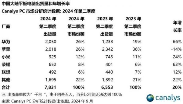 图源:Canalys除华为外,荣耀的表现也非常亮眼,以65.2万台的出货量位居第四,同比增长高达63%,仅次于华为。小米则继续保持在第三的位置,出货量为92.5万台,与第一季度几乎相同。总体来看,2024年第二季度的平板电脑品类里,除苹果出货量同比下跌14%外,其余品牌均取得了显著增长。
