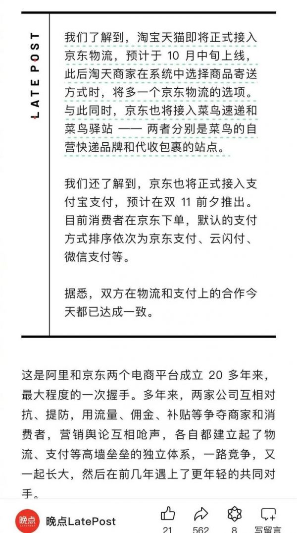 图源:晚点LatePost同时,京东也将接入菜鸟速递和菜鸟驿站,作为代收包裹的站点。甚至不久之后,京东将正式接入支付宝,双方物流和支付系统渐渐开始打通。