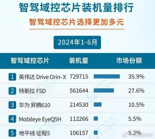 如果说智驾芯片里谁是领头羊,英伟达的Orin-X芯片和特斯拉的FSD芯片当仁不让,根据盖世汽车研究院的数据显示,2024年1-6月份的智驾域控芯片装机量排行,英伟达的Drive Orin-X以近73万颗占了35.9%的市场份额,而特斯拉则是以56万颗占了27.6%的市场份额。
