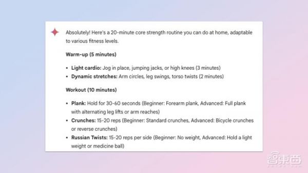 要想启用此功能,用户只需要对Gemini说:“我正在寻找一种快速有效的20分钟家庭锻炼方案,专注于核心力量。您能否针对不同的健身水平提供明确的建议方案?”