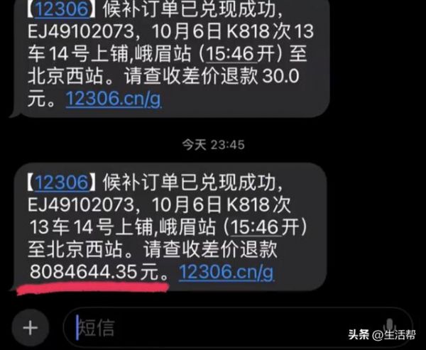 近日,李女士在12306上购买国庆返程票时,候补成功后,收到差价退款8084644.35元短信。
