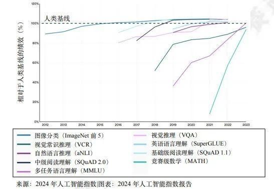 《报告》分析认为,截至2023年,人工智能在一系列任务中已达到超越人类能力的性能水平,但仍有一些任务类别的人工智能未能超越人类能力,如视觉常识推理和高级数学问题解决(竞赛级数学问题)。(如下图)