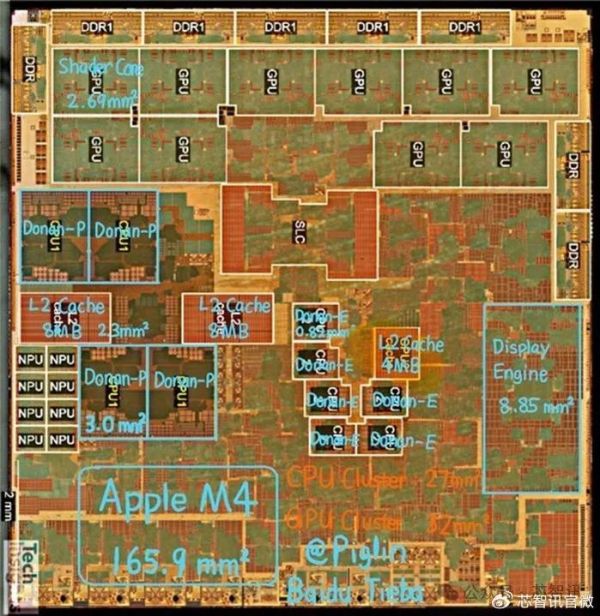 9月30日消息,近日网友 @Piglin 在百度贴吧发布了一张据称是高通骁龙X 处理器内部结构图,展示了其内部的12个CPU内核以及巨大的缓存,整体的芯片面积达到了169.6平方毫米,略高于苹果的10核心的M4的面积169.6平方毫米。