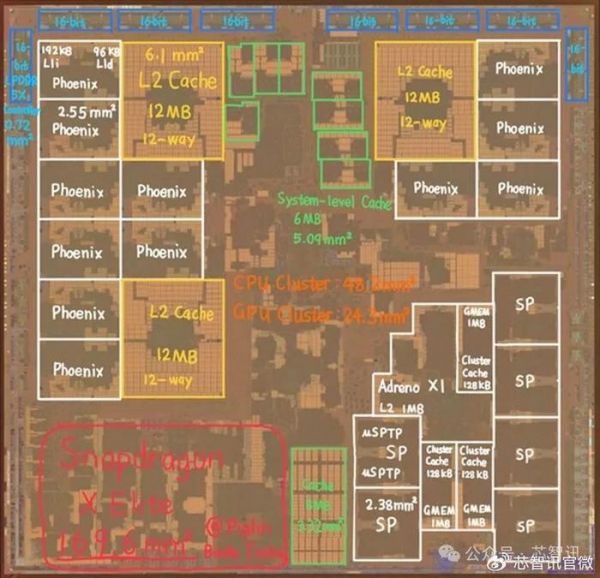 高通骁龙X内部结构曝光:核心面积169.6mm²,CPU及缓存占据1/3
