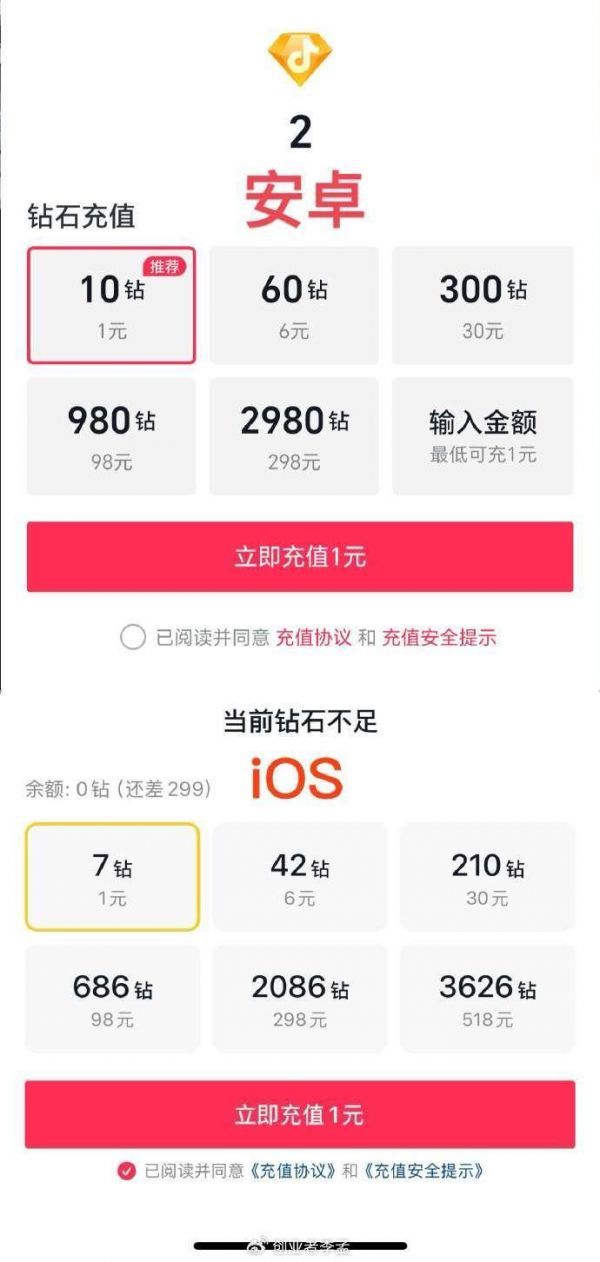 所以我们发现在充值一些爱奇艺、喜马拉雅等视听平台会员的时候,在一些抖音、微信要做直播打赏的时候,需要充值虚拟的货币的时候,苹果是参与抽成的!最明显感知那就是其他的手机上1块钱买10个微信豆,但是iPhone手机只能买7个。同样抖音上也是如此!