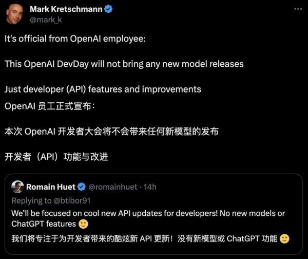 更令人意外的是,根据官方的剧透,OpenAI在DevDay期间不会发布其下一代主要旗舰模型,而是将重点放在API和开发者服务的更新上。