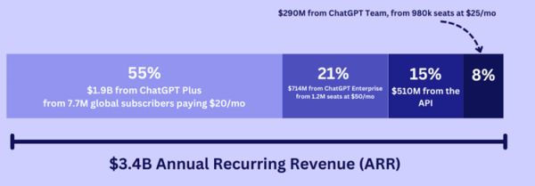 根据FutureSearch公布的研究报告和相关数据,OpenAI年收入为34亿美元,其中76%的营收来自ChatGPT付费用户(ChatGPT Plus、ChatGPT Enterprise和ChatGPT Team订阅),API接口服务贡献了公司15%的收入,约5.1亿美元。