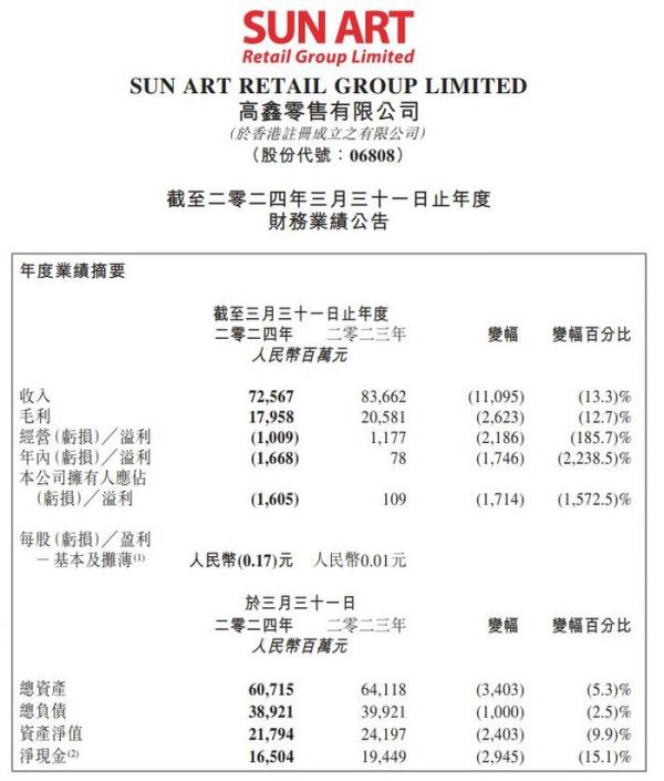 这也是自2011年上市以来首次出现亏损。尽管在2023财年,高鑫零售的净利润实现了扭亏为盈,但仅有区区1.09亿元。今年5月,大润发母公司高鑫零售披露了截至3月31日的2024财年业绩报告。报告显示,公司实现营收725.67亿元,同比下降13.3%;全年亏损金额高达16.05亿元,上年同期为1.09亿元,成为高鑫零售2011年上市以来最大规模的亏损。